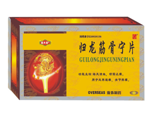 [藥品名稱] 通用名稱:歸龍筋骨寧片 漢語拼音:Guilong Jinguning Pian [成 份]穿山龍、當(dāng)歸、桃仁(炒)、桂枝、丹參、 地楓皮、制草烏、乳香(炒)、蒼術(shù)(炒 )、川牛膝、威靈仙、甘草、千年健、紅 花、馬錢子(制)。 [性 狀]本品為糖衣片,除去糖衣顯褐色;氣芳香, 味苦。 [功能主治]祛風(fēng)活血,舒筋止痛。用于風(fēng)寒濕痹,關(guān) 節(jié)疼痛。 [規(guī) 格]基片重0.25g [用法用量]口服。一次2片,一日1~2次。